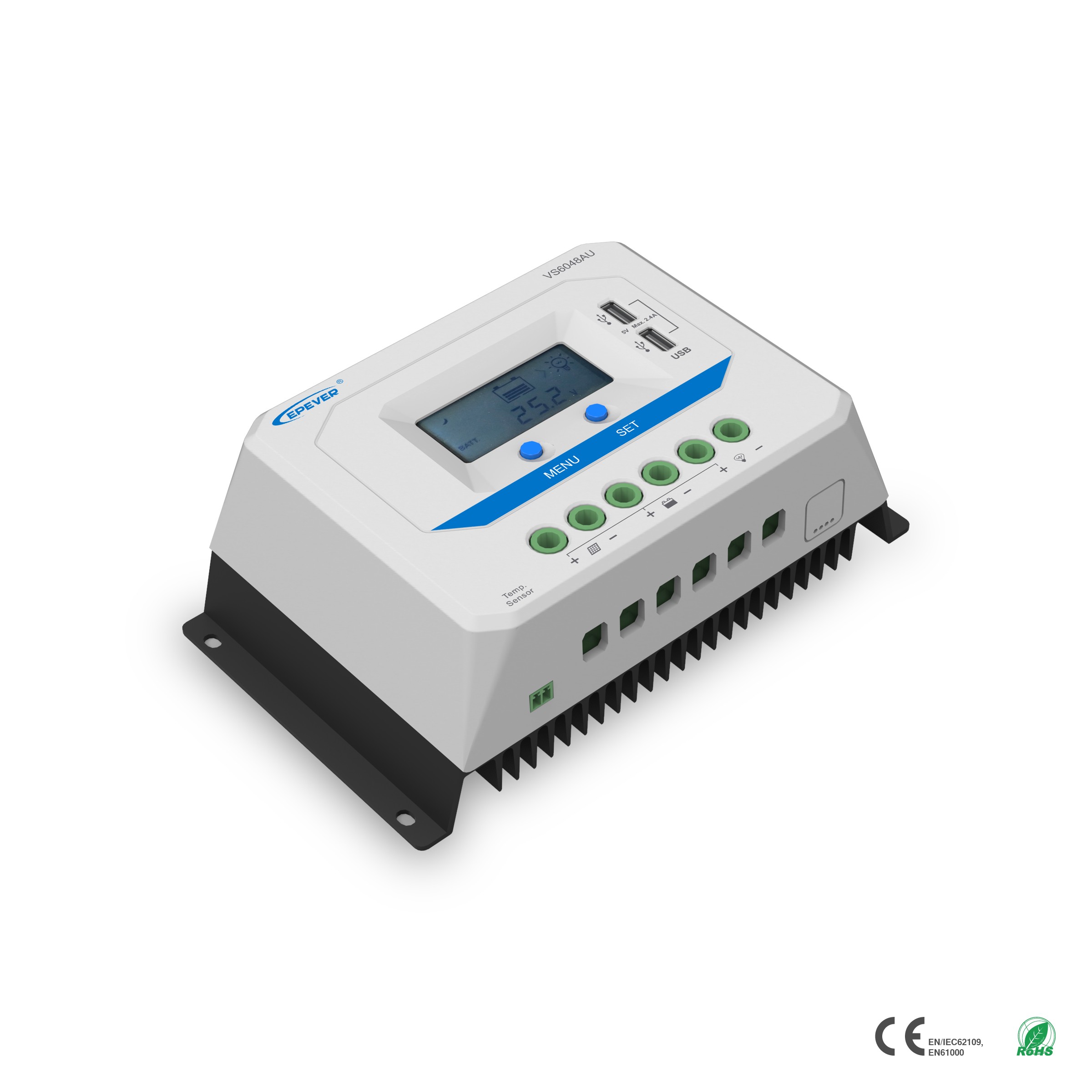 VS-AU series is a PWM charge controller with LCD display and two USB ports. When the gap between solar panel working voltage and battery voltage is not big, choosing this PWM series is an equally reliable but more cost-effective solution. It is widely applied to rural Electrification and home power systems etc.