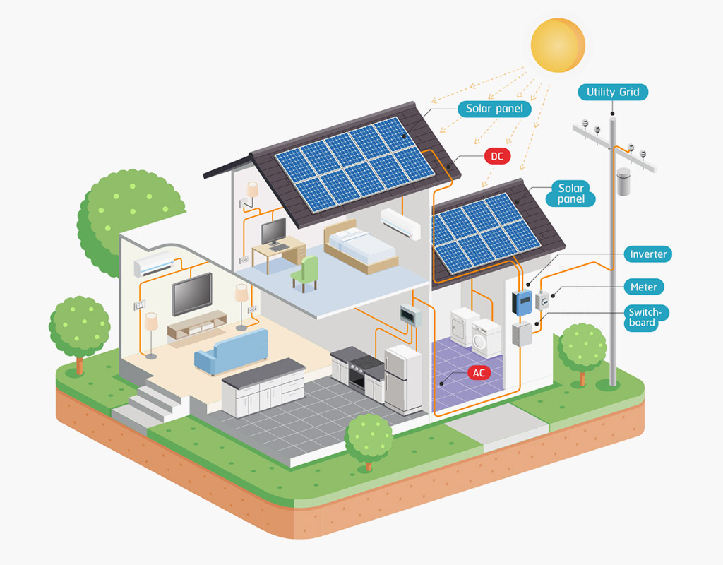 - Inverter sangat penting untuk konversi energi yang dikumpulkan dari panel ke sumber listrik yang dapat digunakan terus menerus di rumah Anda.