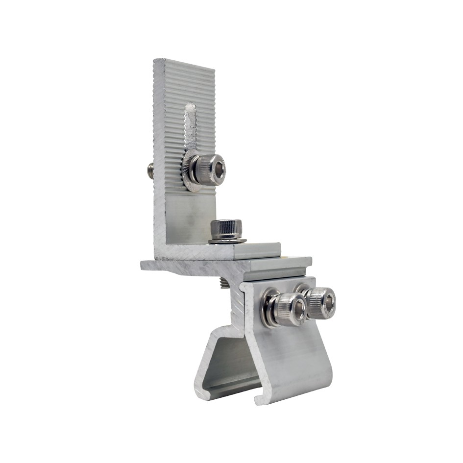 Dirancang untuk menjepit langsung ke profil atap lembaran logam Klip-Lok 700. Braket ini memungkinkan pemasangan susunan panel surya tanpa penetrasi lembaran atap. Untuk digunakan dengan L-Bracket, lubang M8, termasuk sekrup kepala 20mm, untuk memasang braket L.